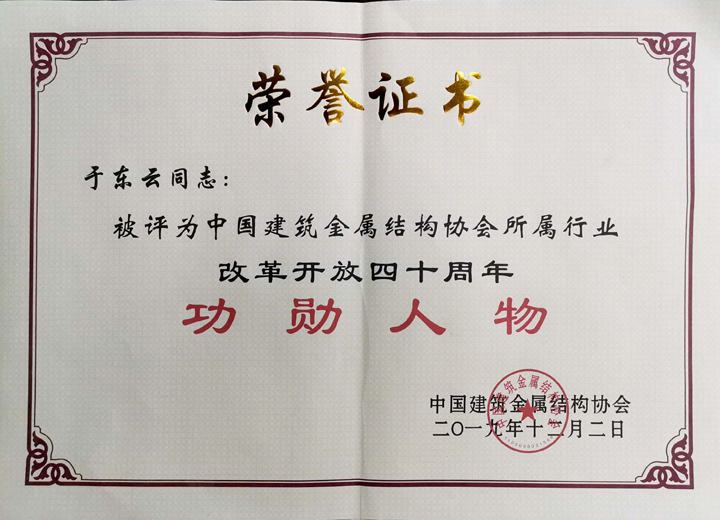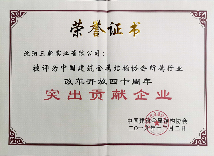三新集團(tuán)于東云董事長榮獲“中國建筑金屬結(jié)構(gòu)協(xié)會所屬行業(yè)改革開放四十年突出功勛人物”稱號,三新集團(tuán)榮獲“中國建筑金屬結(jié)構(gòu)協(xié)會所屬行業(yè)改革開放四十年突出貢獻(xiàn)企業(yè)”稱號。于東云董事長被選為中國建筑金屬結(jié)構(gòu)協(xié)會第十一屆理事會名譽(yù)副會長。