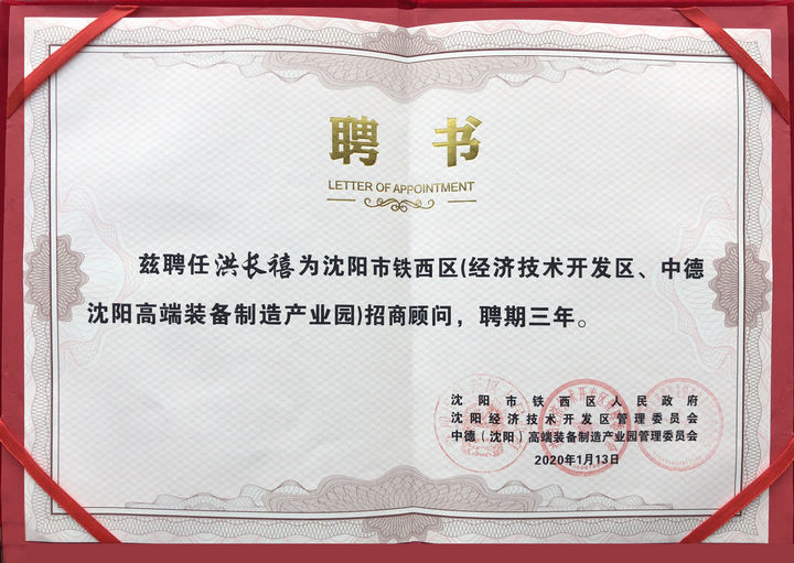 日前,我公司洪長禧總經(jīng)理被聘任為沈陽市鐵西區(qū)(經(jīng)濟(jì)技術(shù)開發(fā)區(qū)、中德沈陽高端裝備制造產(chǎn)業(yè)園)招商顧問。自從入駐沈陽以來,不忘初心、不辱使命,勇于創(chuàng)新,多年來為經(jīng)濟(jì)技術(shù)開發(fā)區(qū)、鐵西經(jīng)濟(jì)社會實(shí)現(xiàn)高質(zhì)量發(fā)展,為鐵西區(qū)老工業(yè)基地全面振興做出了應(yīng)有的貢獻(xiàn)!尤其是積極參與謀劃中德沈陽高端裝備制造產(chǎn)業(yè)園的發(fā)展,并成為入駐園區(qū)龍頭企業(yè)。相信隨著產(chǎn)業(yè)園的蓬勃發(fā)展,我公司會如虎添翼,更上一層樓!