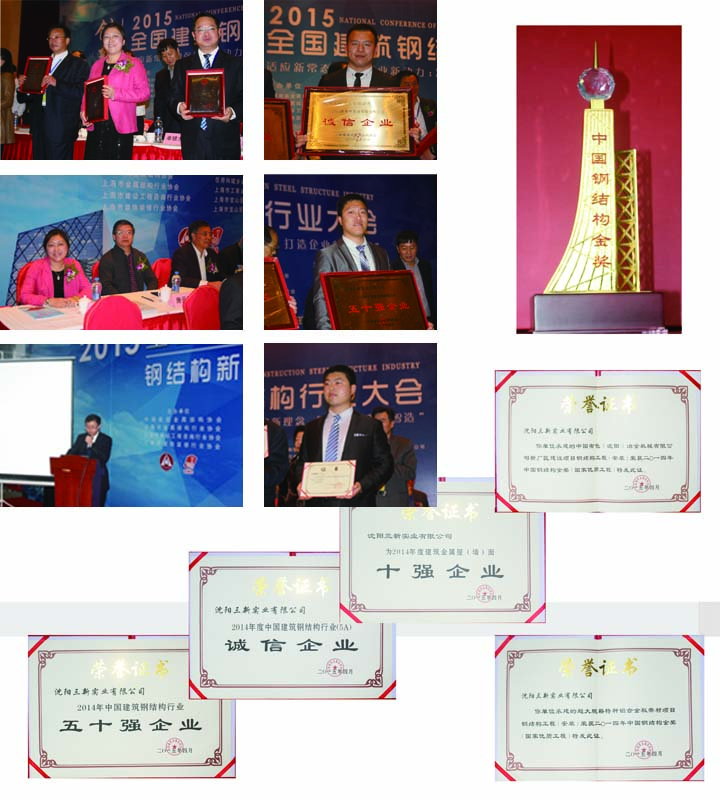 本屆大會(huì)是表彰盛會(huì),它被譽(yù)為鋼結(jié)構(gòu)行業(yè)的“東方奧斯卡盛典”共有十二個(gè)獎(jiǎng)項(xiàng)在此頒發(fā)。三新集團(tuán)董事長(zhǎng)兼遼寧省建筑金屬結(jié)構(gòu)協(xié)會(huì)會(huì)長(zhǎng)于東云率團(tuán)參加了本次大會(huì),并做了主旨演講。公司工程部高剛部長(zhǎng)在“鋼結(jié)構(gòu)新技術(shù)、新產(chǎn)品交流會(huì)”上介紹并展示了公司的新技術(shù)新產(chǎn)品。公司承建的中國(guó)有色(沈陽(yáng))冶金機(jī)械新廠區(qū)建設(shè)項(xiàng)目、中鋁集團(tuán)東北輕合金有限責(zé)任公司超大規(guī)模特種鋁合金板帶材項(xiàng)目及優(yōu)化特種鋁合金板帶材產(chǎn)品結(jié)構(gòu)配套項(xiàng)目分獲第十一屆第二批“中國(guó)鋼結(jié)構(gòu)金獎(jiǎng)”。同時(shí)公司還獲得2014年度“中國(guó)建筑鋼結(jié)構(gòu)誠(chéng)信企業(yè)(5A)”企業(yè)、“2014年度全國(guó)鋼結(jié)構(gòu)行業(yè)50強(qiáng)企業(yè)”、“2014年度金屬屋墻面行業(yè)十強(qiáng)企業(yè)” 稱號(hào),于東云董事長(zhǎng)榮獲“2014年度全國(guó)鋼結(jié)構(gòu)行業(yè)優(yōu)秀企業(yè)家” 稱號(hào)、王國(guó)臣榮獲 “2014年度全國(guó)鋼結(jié)構(gòu)行業(yè)優(yōu)秀車間主任”稱號(hào)、吳龍榮獲“2014年度行業(yè)協(xié)會(huì)優(yōu)秀工作者” 稱號(hào)。公司還派團(tuán)參加了“2015年鋼結(jié)構(gòu)龍頭企業(yè)業(yè)績(jī)及配套產(chǎn)品展覽會(huì)”,公司及產(chǎn)品得到參會(huì)客商的良好評(píng)價(jià)。