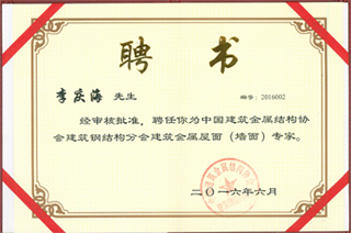 近日獲悉,我公司總工程師李慶海被聘為中國建筑金屬結(jié)構(gòu)協(xié)會鋼結(jié)構(gòu)分會建筑金屬墻面(屋面)專家。